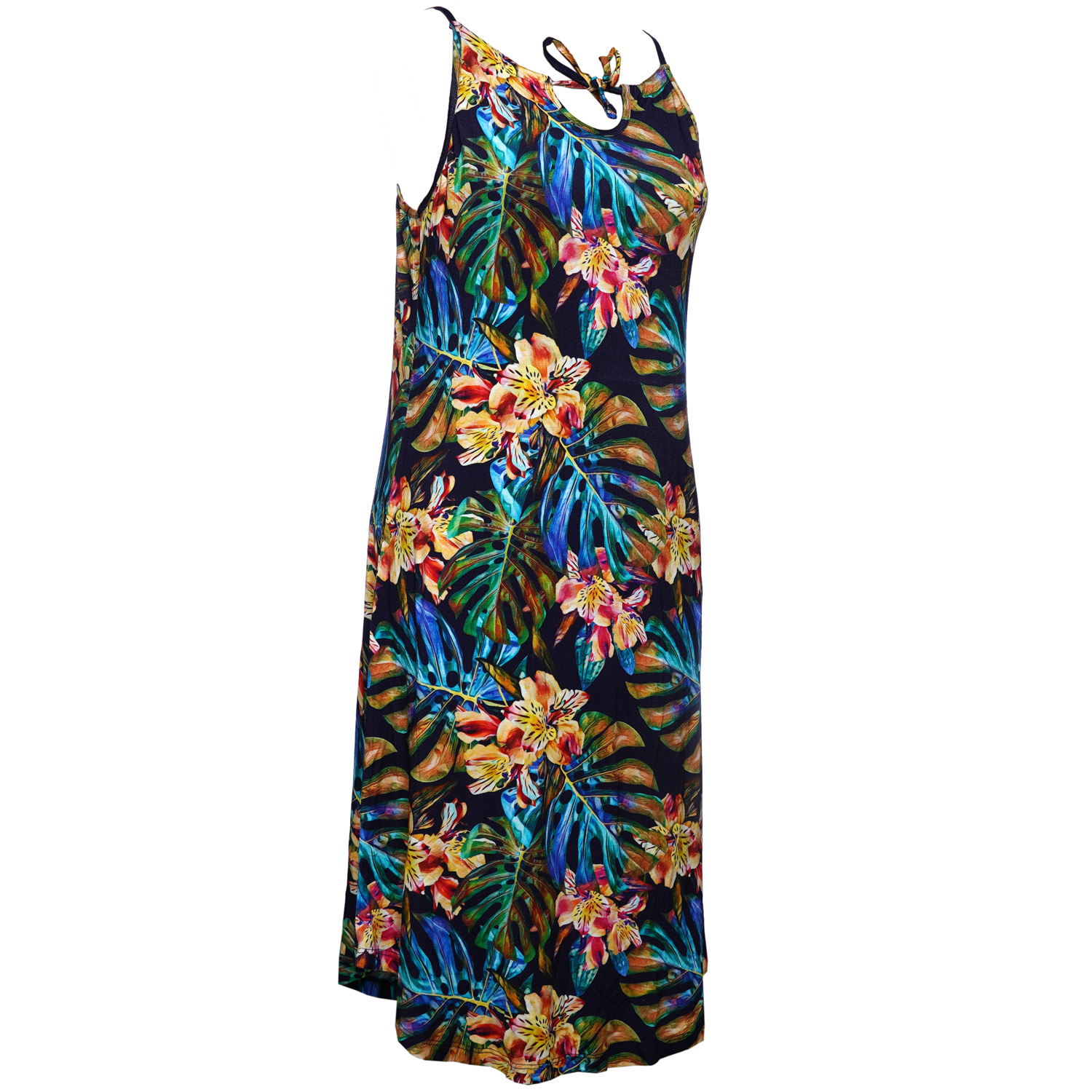جزیُیات مدل:پیراهن بندی زنانه با برش آزاد و سبک،بدون آستین و با یقهگرد بسته شونده در پشت،طرح گل ها استوایی و برگ های رنگارنگ در زمینه ی تیره،مناسب فصل تابستان،بیسار چشم گیر و خاص